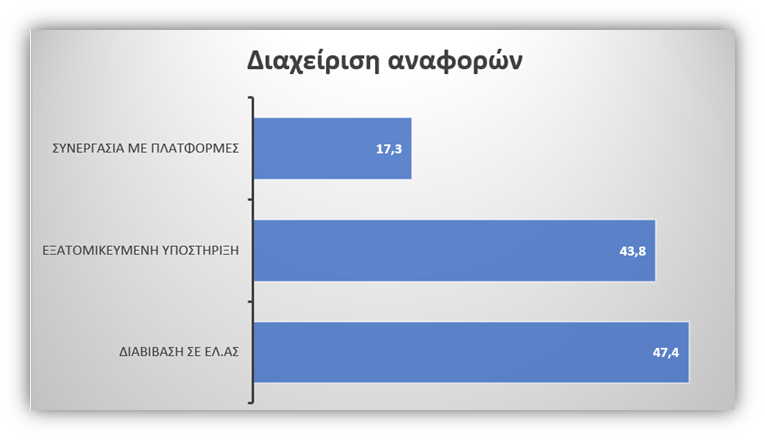 - 43,8% συνοδεύτηκε από εξατομικευμένη απάντηση και συμβουλευτική υποστήριξη προς τους καταγγέλλοντες.